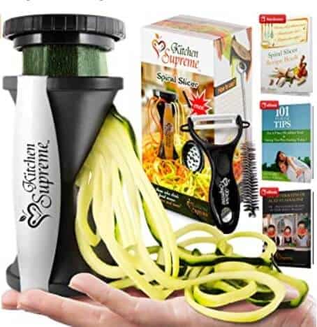 The Kitchen Supreme Zucchini Spiral Noodle Maker is a handheld spiraliser designed for making vegetable spaghetti/noodles to replace traditional gluten pasta and noodles when you’re wanting to avoid carbs or simply increase your vegetable intake.